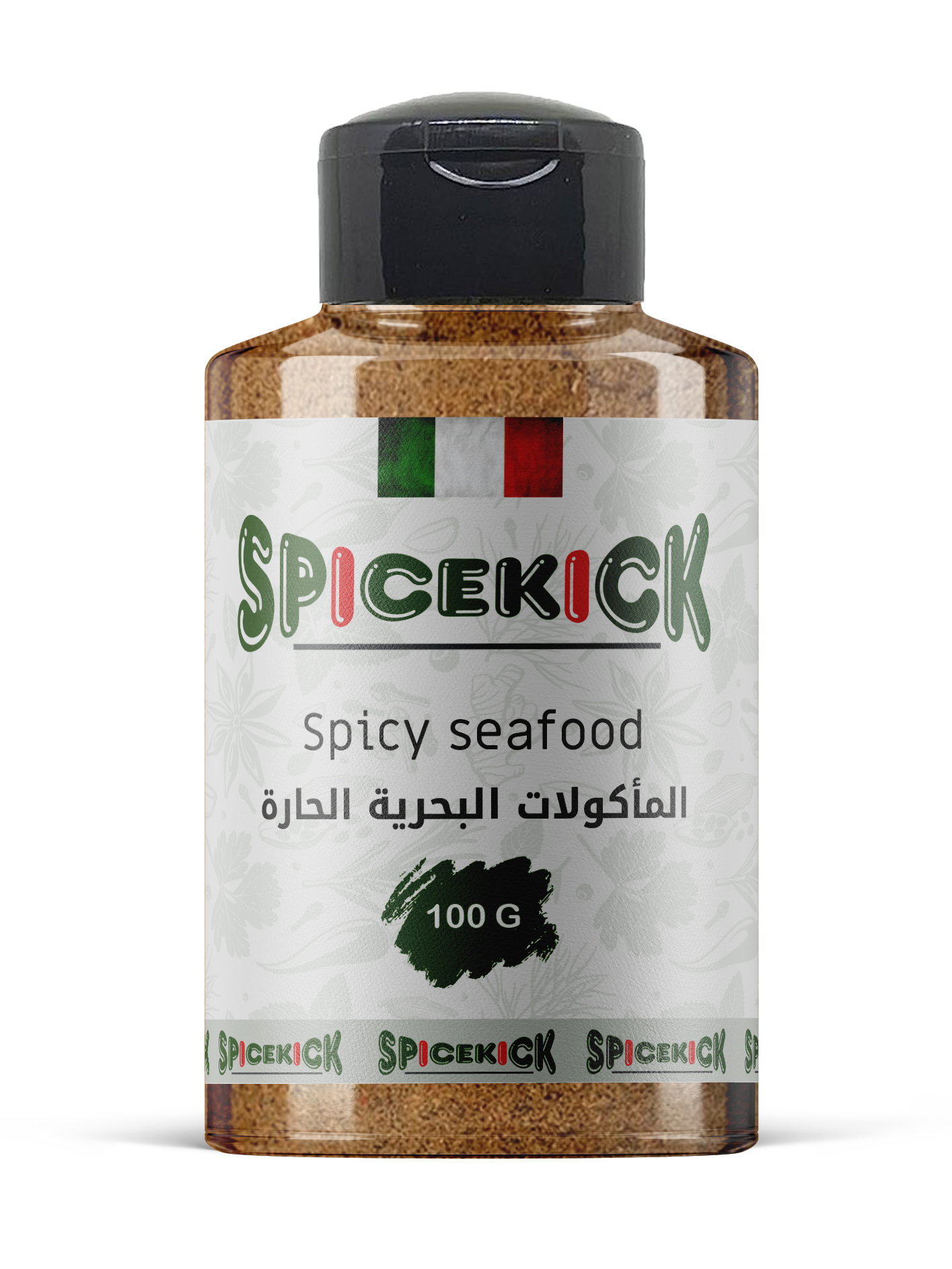 توابل المأكولات البحرية الحارة SPICEKICK 100 جرام مزيج طبيعي 100٪ من البهارات التي تضفي حرارة ونكهة غنية للأسماك، الروبيان، المحار، الأطباق البحرية والشوربات البحرية. خالٍ من المواد الحافظة ويمنح طعمًا متوازنًا للأطعمة البحرية.