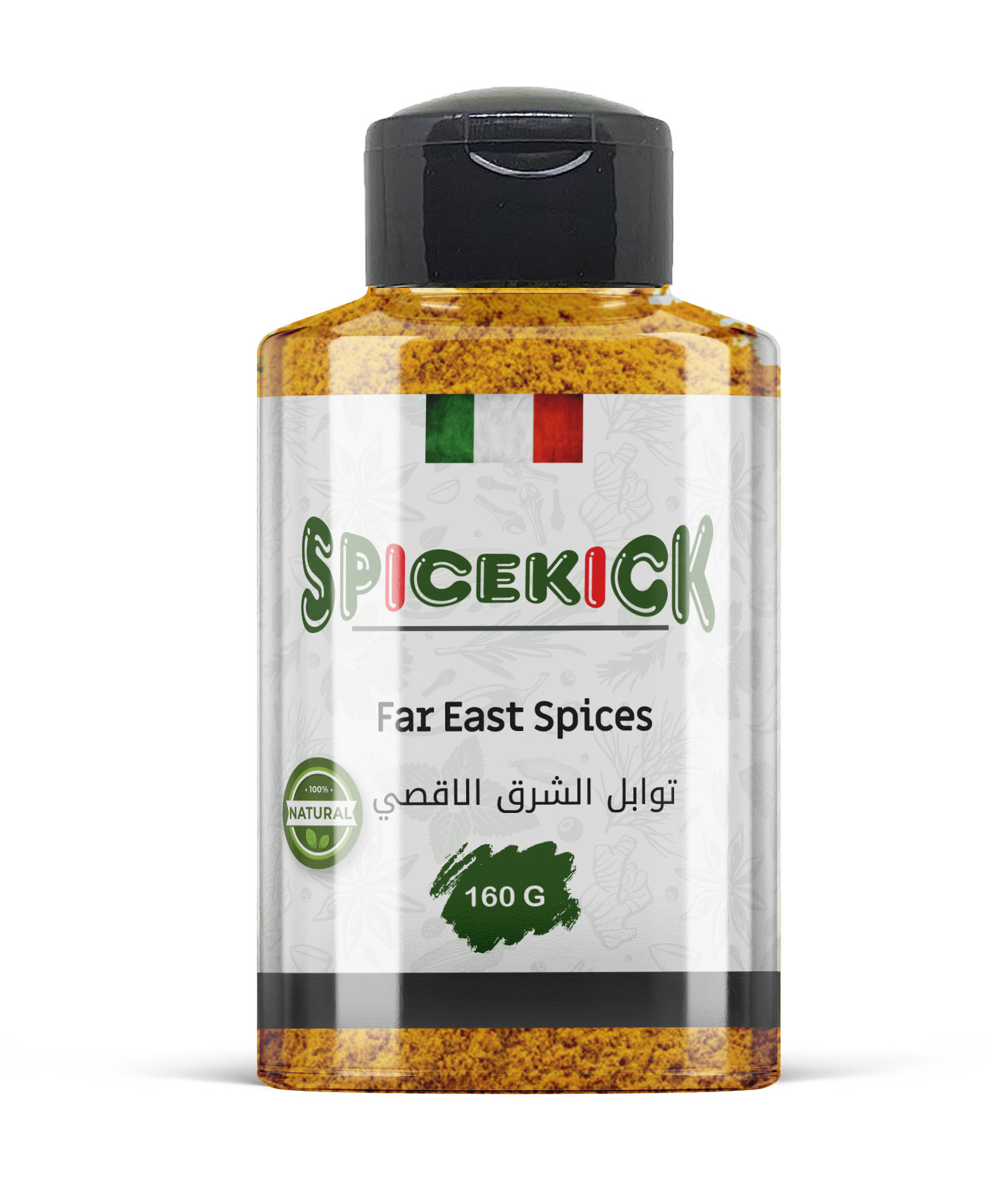 توابل الشرق الأقصى من SPICEKICK 160 جرام تمنح أطباقك نكهة غنية ومميزة مستوحاة من المطبخ الآسيوي. تحتوي على مزيج متوازن من التوابل الطبيعية التي تضيف طعمًا لذيذًا عند الطهي أو القلي. سهلة الاستخدام، خالية من المواد الحافظة، وتضمن توزيع نكهة متجانس في كل وصفة سواء للاستخدام المنزلي أو المطاعم.